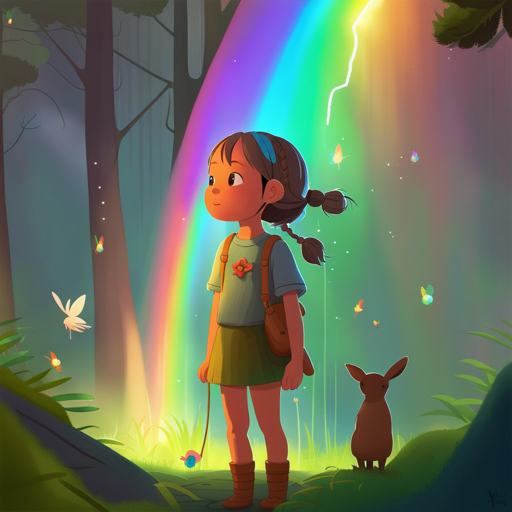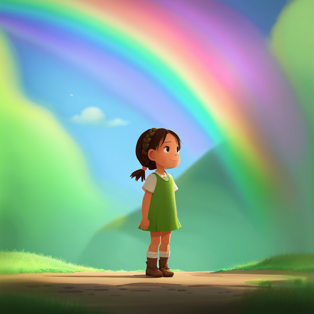 Once upon a time, in a peaceful village, lived a curious little girl named Florence. She had sparkling blue eyes, brown braids, and always wore her favorite green dress. One sunny morning, Florence noticed a vibrant rainbow spanning across the sky, ending in the deep forest nearby. A sense of adventure took hold of her, and she decided to find the end of the rainbow.